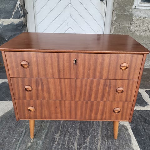 Flott liten retro kommode i teak med lås og nøkkel. Klar til bruk. Kan hentes i Øyer eller på Manglerud i Oslo. Frakt til Oslo 200 kr.