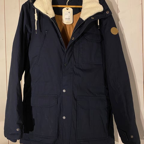 Henry Choice Origins vinterjakke i størrelse M. Jakken er blå og har hette. Ytterstoffet består av 65 % polyester og 35 % bomull, med fôr og vattering i 100 % polyester.