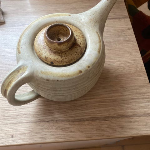 Tekanne i keramikk med bambushåndtak fra Flying Tiger, kjøpt for mange år siden, men lite brukt. Kommer med tesil inni kanna.