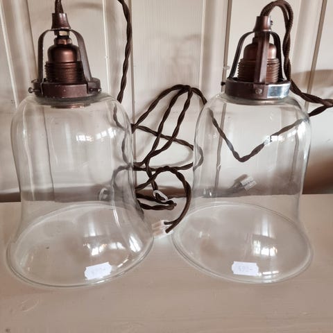 2 stk taklamper. Horlick’s malted milk står det på dem. Ca 30 cm høye