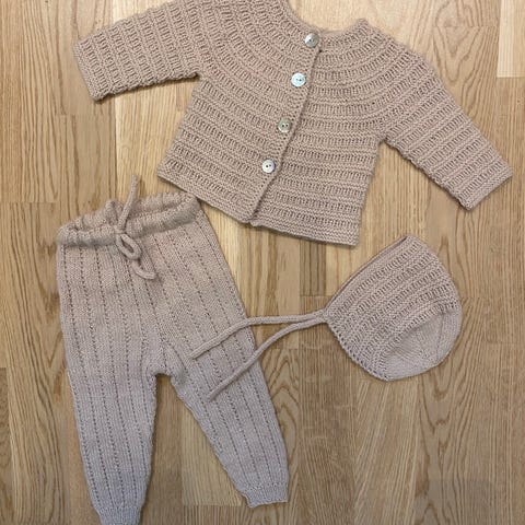Hjemmestrikket Sorgenfri jakke og bukse av Seaside settet av Petiteknit. Jakka er strikket i en tråd Sunday og en tråd tynn silk mohair fra Sandnes Garn. Buksa er strikket i Sunday (100% merinoull). Bruksmerker i form av noen få nupper her og der. Har mulighet for å strikke matchende lue, kyse, votter, sokker eller tøfler på forespørsel 😊 størrelse 0-1 mnd etter og passet vår nyfødte gutt med å brette opp ermene på jakka. Kan nok fint brukes som hentesett.