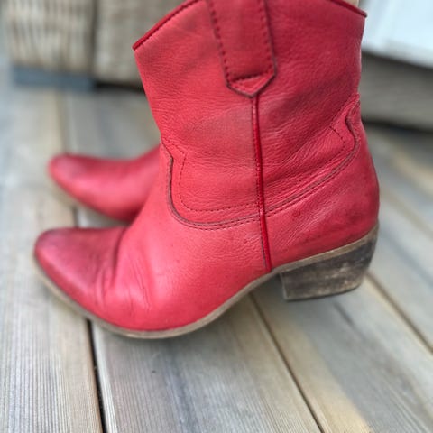 støvler i brun farge i størrelse 39. Støvlene har høyt skaft med dekorative sømmer i western-inspirert stil og middels høy hæl. Glidelås på innsiden for enklere av- og påkledning.