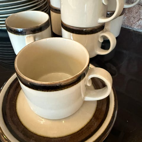 Inneholder: to fat, en litt dypere bolle, suppeterrin med lokk, sausenebb og seks dype tallerkener. Noe har anmerkninger på undersiden, se bilder