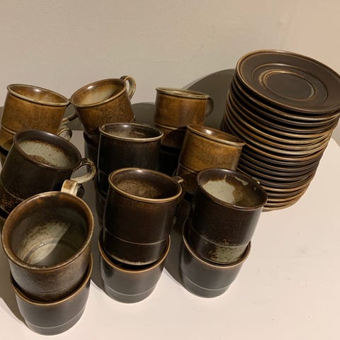 Selger 8 stk. vintage sett med kaffekopper og skåler fra Porsgrund, modell Lava. Designet av Eystein Sandnes og produsert i Porsgrunn på 1970-tallet. Norsk design. Retro. Koppene er 7 cm høye og 7,5 cm i diameter. Skålene er 14 cm i diameter. Veldig bra stand. 100 kr per sett, 700 kr samlet. Kan hentes (Grünerløkka eller Sentrum) eller sendes.