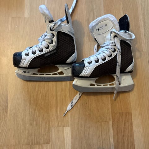 Bauer ishockeyskøyter for barn i størrelse Y9. Modellen er laget for ishockeybruk, med sort overdel, hvite lisser og hvit skøytestålholder. Skøytene har polstret ankelparti og hælkappe for støtte, samt snøring for justering av passform. Egnet for barn som skal bruke skøytene til ishockey eller generell skøytebruk på is.