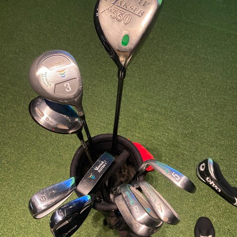Golfsett med jernkøller og golfbag. Sett med flere jernkøller i metall, samt golfbag med bærestropp og flere lommer til oppbevaring av utstyr og tilbehør. Egnet for golfspill på bane eller trening på driving range. Kan være behjelpelig med frakt i Bergen og Stord området
