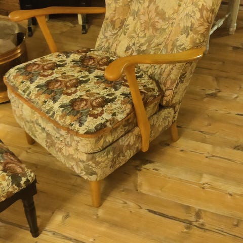 Gammel lenestol med puff - opprinnelig fra engelsk herregård