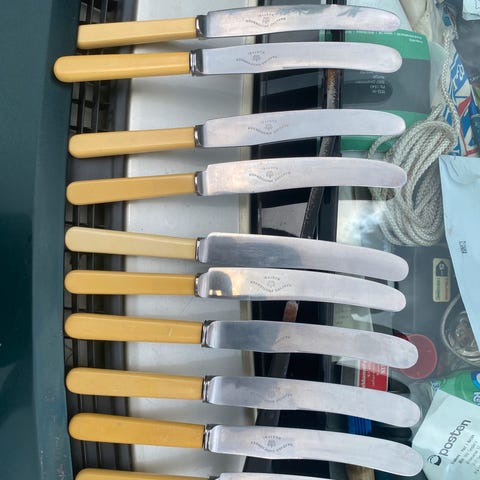 kniven er 25,5 cm lang med rustfritt stålblad - håndtaket er noe løst - men hele kniven er pen og veier 58 gram.
