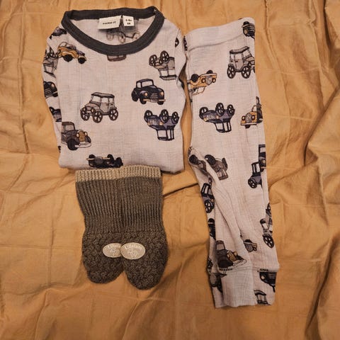 Name it ullbukse for gutt i størrelse 50. Har to stk av dem som vist på bildet, ingen overdel til. Buksen er hvit i merinoull med bilmotiv. Passer som innerlag eller pysjbukse til baby. Elastisk linning i livet for god passform.