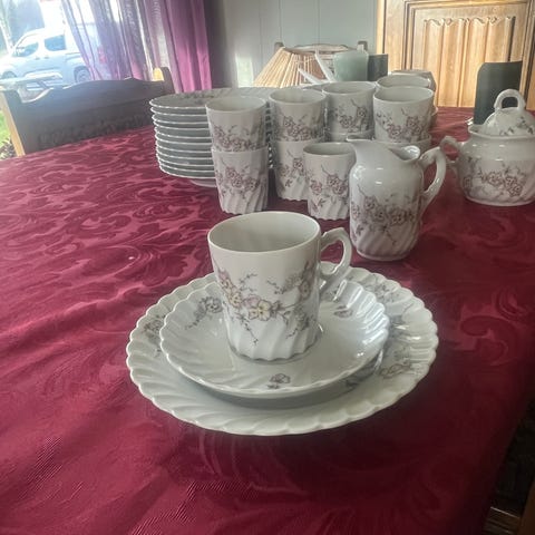 Vakkert PP service både til kaffe og middag fra 1950. Serviset består av 8 kopper med 12 skåler og asjetter, 12 hver av middagstallerkner, lunsjtallerkner, suppetallerkner, dessertskåler. Tre dype serveringsboller og en supperterrin, 2 stk serveringsfat runde og 4 stk avlange.