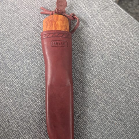 Turkniv med trehåndtak og lærslire. Kniven har rett blad med spiss tupp, og håndtaket er laget i lyst tre med markert fasong for godt grep. Sliren er laget i brunt lær med snøring langs kanten og hempe for feste i belte. Total lengde på kniv og slire er vist på bilde med målebånd for omtrentlig størrelse. Egnet som tur- eller brukskniv etter behov.