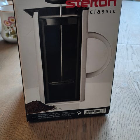 Nydelig sett med presskanne og 6 kopper selges. Perfekt til kaffeelskere! Settet er pent brukt og i god stand.