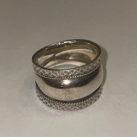 Ringen har en oval, mørk stein/innlegg (usikker på hva) i front og bred ringskinne som smalner bak. Hovedmaterialet er sølv kombinert med andre materialer i innlegget. Passer til både hverdagsbruk og mer formelle anledninger, og kan brukes alene eller sammen med andre ringer.