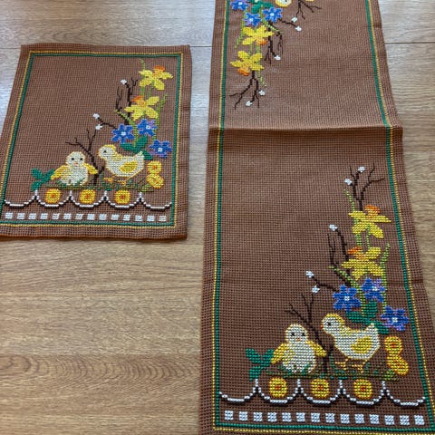 tekstil med blomsterbroderi. Kvadratisk stoffstykke med korsstingsbroderi av blomster og en sommerfugl i midten, samt bord rundt kanten. Tekstilet kan brukes som dekorativt bilde, putetrekk eller annet interiørprosjekt.