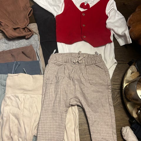 10 stk body i supermyk bomull fra Cubus, 1 heldrakt fra newbie, 1 genser fra Lindex, 2 bukser og 9 par sokker.