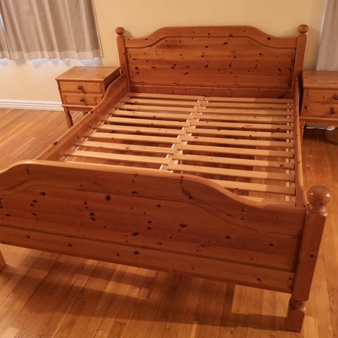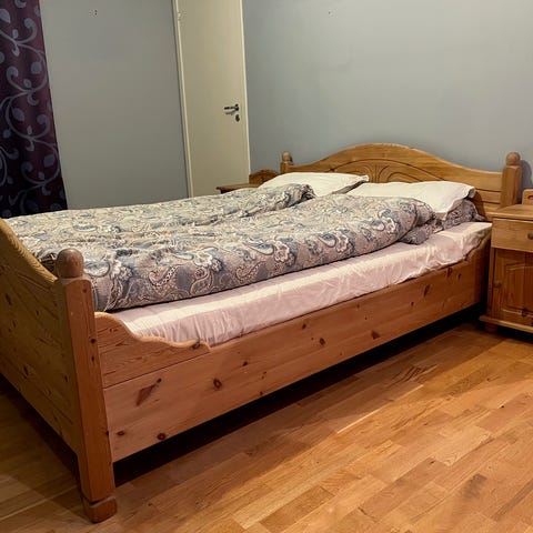 Seng i furu, lakkert. Merke: Stompa. Brukt 1995-2010, deretter som gjesteseng. Pen, uten synlig slitasje, klistremerker el.l. Fjærmadrass følger med.