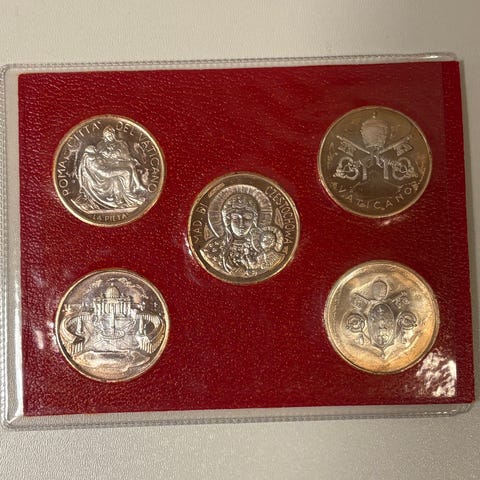 Det Norske Myntverket Kongeriket Norge myntsett i etui. Sett med åtte mynter presentert i et mørkt etui med innvendig fløyelsfôr. Innsatsen er merket «Kongeriket Norge» og «Det Norske Myntverket». Myntene ligger i individuelle kapsler. Medfølgende dokumentasjon/sertifikat vises på bildet. Egnet som samlerobjekt eller som presentasjonssett for norske mynter.