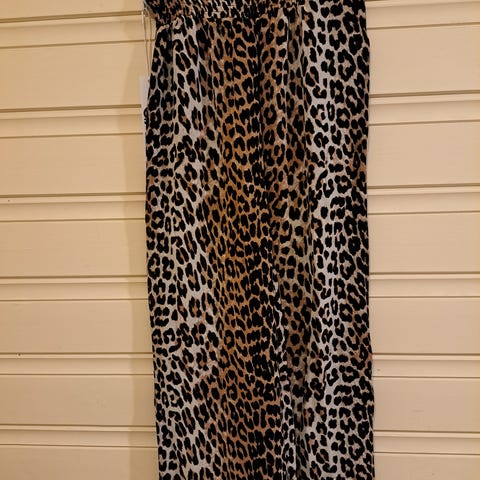 Ganni skjørt for dame i størrelse 38. Skjørtet har flerfarget leopardmønster i toner av beige og svart. Plagget er plissert og rekker omtrent til under kneet, avhengig av høyde. Lukkes med glidelås.