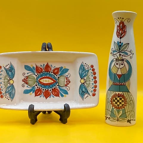 Fargerik vase med fisk, italiensk, men vet ikke opphav. Noen sår, se bilde. 15 cm høy. Kr 245,-+ evt frakt