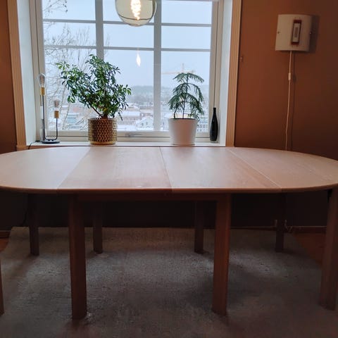 Spisebord 110cm langt slik det står på bildet. 3 ileggplater a 40cm hver følger med.