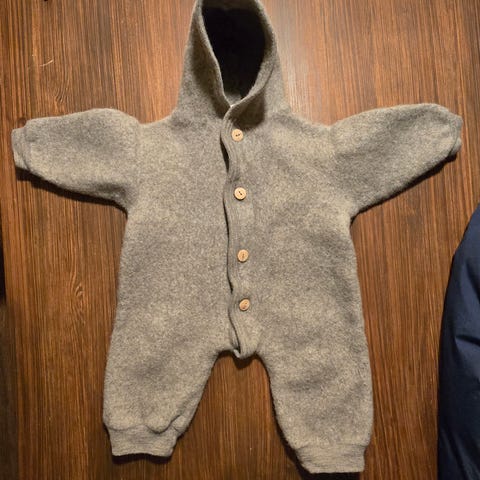 Grå ulldress/hentedress fra Nøstebarn til baby i størrelse 50. Dressen er i 100 % ull, har hette og ermene kan brettes over hendene i stede for votter. Veldig praktisk med tanke på at votter ofte ikke sitter på. Lukkes med knapper foran og har ribbekanter ved ermer og ben for bedre passform. Egnet som ytterplagg eller mellomlag for nyfødt og små babyer i kjøligere vær.