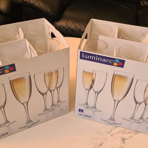 Glassene har rett, svakt konisk form med tykk bunn. På siden av glassene er det preget dekor/tekst i glasset.