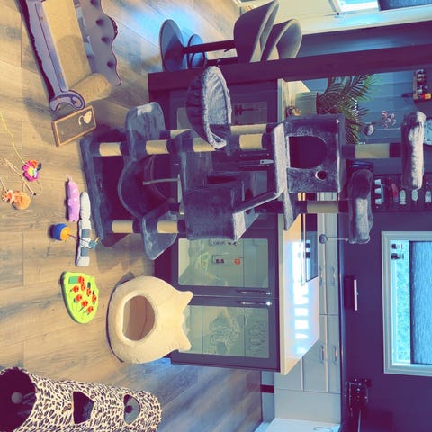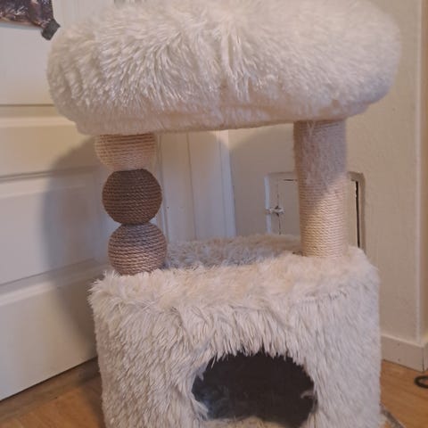 Klatrestativ for katt i grå plysj med flere nivåer. Stativet har liggeplate øverst, hengekøye i midten og ekstra liggeplate på siden. Nederst er det en tunnel/liggehule. Stolpene er delvis trukket med sisaltau for kloring.