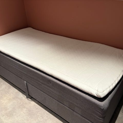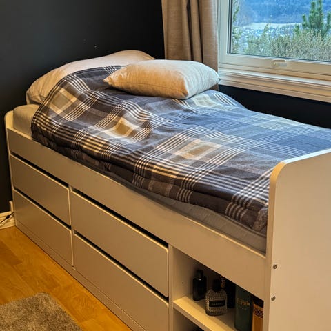 90 madrass seng med nattbord og to skuffer. Åpent under sengen som kan brukes til lek eller oppbevaring, evt kosekrok.