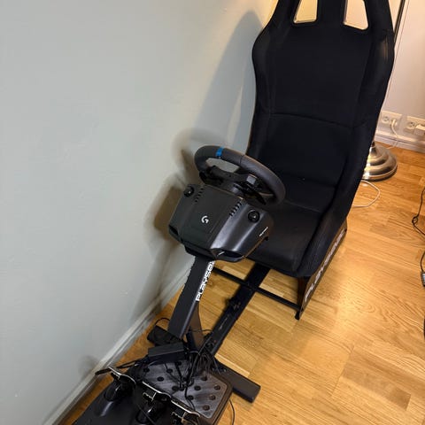 Selger Playseat (Evolution?) Alcantara stol, Logitech G923 ratt og pedaler, Driving Force Shifter girspake og Playseat gulvmatte grunnet plassmangel.