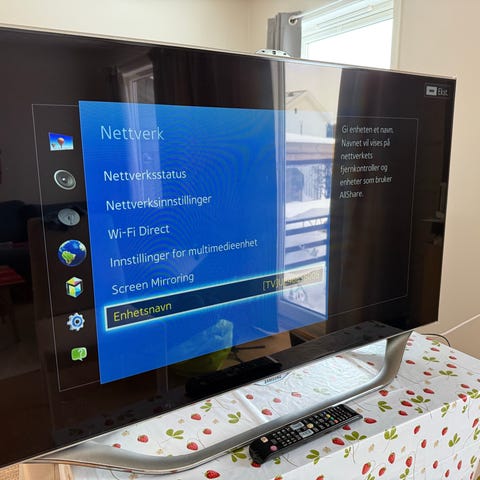 Samsung smart-TV med fjernkontroll. TV-en har innebygde strømmetjenester og hjemmemeny med tilgang til ulike apper. Skjermen er flat og egnet for bruk i stue eller soverom til TV, film og strømming av innhold fra internett eller tilkoblede enheter via HDMI og andre tilkoblingsmuligheter som vanligvis finnes på Samsung smart-TV-er.