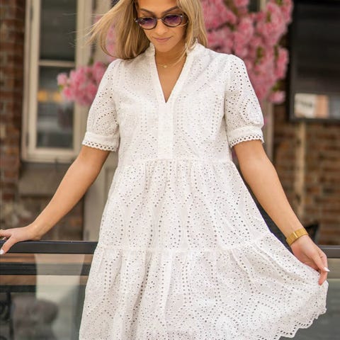Åh, se på denne vakre kjolen fra Ichi som oser av vår og sommer! Kjolen er designet med det fineste broderte mønsteret som er foret på innsiden. Kjolen har gjennomgående knapper og en fin liten A-linjeformet kjole med korte puffermer.