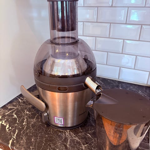 Lite brukt Philips juicemaskin i rustfritt stål. Maskinen har en sentrifuge med metallfilter for effektiv utvinning av juice fra frukt og grønnsaker. Beholder og lokk er i plast, med påmontert tut for tapping av juice. Strømledning med jordet støpsel. Egnet til bruk på kjøkkenbenk for tilberedning av fersk juice til daglig bruk eller ved behov. Flere av delene kan tas av for rengjøring.