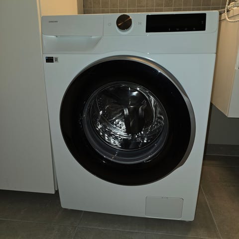 Samsung frontmatet vaskemaskin i hvit utførelse. Maskinen har frontåpning med rund dør og oversiktlig betjeningspanel med dreiehjul og display. Den er utstyrt med digital inverter-motor, som gir jevn drift. Egner seg til vanlig klesvask i husholdning, og kan plasseres frittstående på bad eller vaskerom der det finnes tilkobling for vann og avløp.