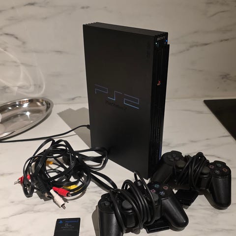 Sony PlayStation 2 spillkonsoll. Standard PS2-modell som støtter PlayStation 2-spill på fysiske plater, med tilkoblingsmuligheter for minnekort og håndkontrollere på fronten. Egnet for bruk med kompatibel TV eller skjerm via riktig videokabel og strømtilkobling. Konsollen kan brukes til å spille originale PlayStation 2-spill og enkelte DVD-filmer