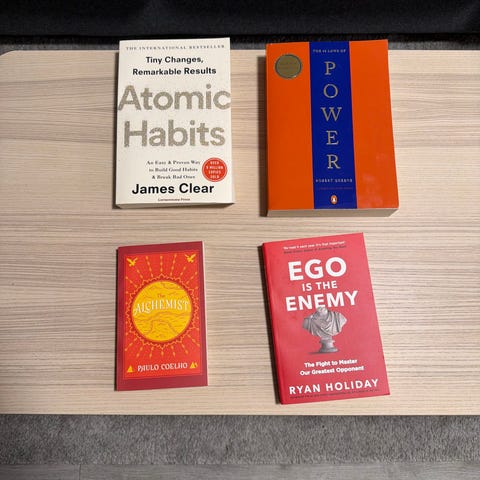 Bokpakke med flere titler innen selvutvikling, filosofi og åndelighet. På bildene vises blant annet «Ego Is the Enemy» og «The Daily Stoic» av Ryan Holiday, «The Book: On the Taboo Against Knowing Who You Are» av Alan Watts og «Ved elven Piedra satt jeg og gråt» av Paulo Coelho. Bøkene er i ulike formater og utgaver, både på engelsk og norsk. Egner seg for lesere som er interessert i temaer som personlig utvikling, stoisisme, identitet og livsfilosofi. Pakken selges samlet slik den fremkommer på bildene.