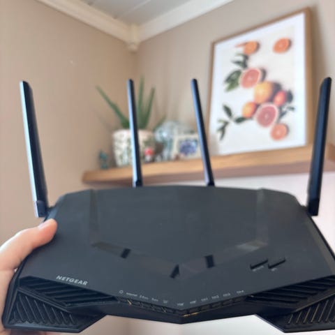Ruteren har flere eksterne antenner for bedre dekning og stabilitet.