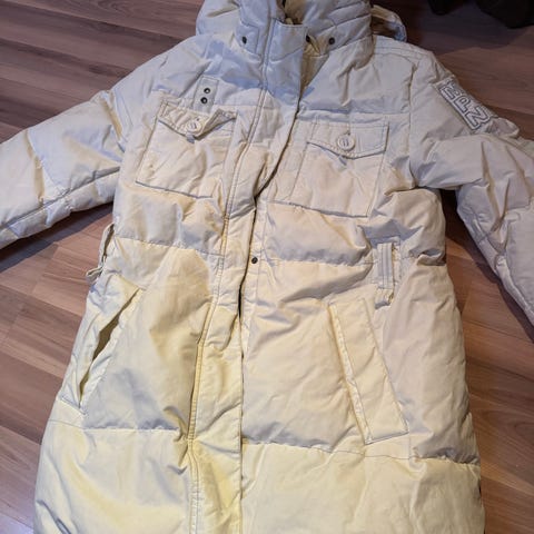 Lang dunjakke fra Leon&Harper i blå farge med hette. Jakken har gjennomgående glidelås foran med trykknapper i frontklaffen. Den er vattert i horisontale felt for jevn isolasjon. Modellen har innsving i livet på noen av bildene, noe som tyder på justerbar eller elastisk midje. Ermene avsluttes med ribbestrikkede mansjetter. Passer som ytterjakke i kaldere vær.