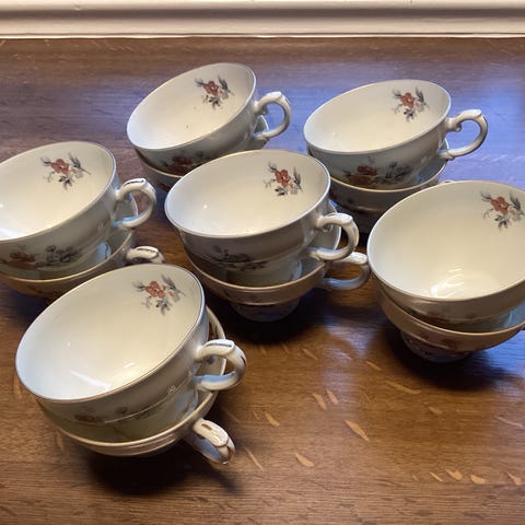 Blomstrete romantisk porselen kaffeservise med gullkant. Består av 12 kopper med tilhørende skåler og asjetter. Nydelig kaffekanne med sukkerskål og fløtemugge.