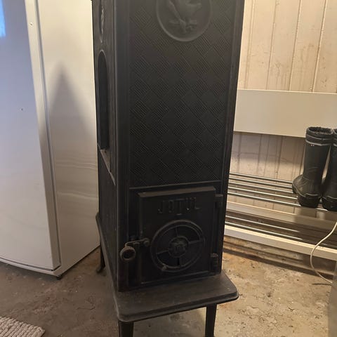 Høy og smal vedovn i støpejern i grå utførelse. Ovnen har flere dører med regulerbare luftspjeld og håndtak i metall. Øverst på fronten er det et dekorativt relieffmotiv. Konstruksjonen er laget for fyring med ved, med egen fyrdør, askeskuff og justerbar trekk. Passer til montering i pipe eller egnet røykutløp der dette er tilrettelagt i boligen.