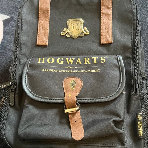 skulderveske i kunstlær for dame med Harry Potter-motiv. Vesken er svart med preget mønster av HP-symboler og detaljer i gullfarget metall. Den har justerbar skulderrem og klaff med spenner foran. På forsiden er det dekorative emblemer med Harry Potter- og Galtvort-logo. Passer til hverdagsbruk, til å bære mindre personlige eiendeler som mobil, lommebok og nøkler. Helt ny ubrukt