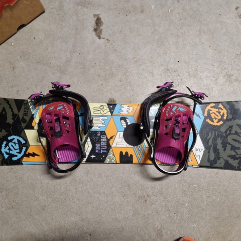 K2 Mini Turbo snowboard med bindinger og snowboardboots for barn.
