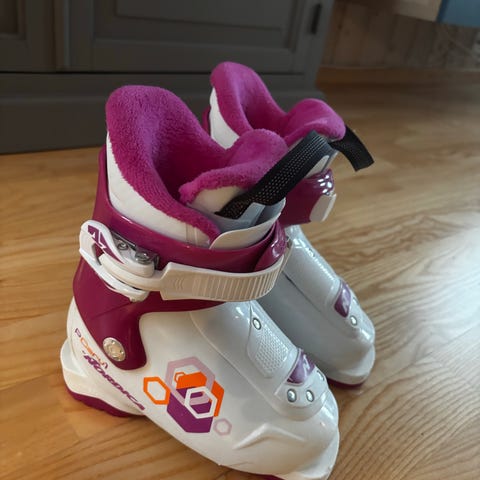 Nordica Team barneskistøvler i hvit og rosa farge. Modellen har justerbar spennelukking foran og bak for enkel tilpasning rundt fot og legg. Det står 195 mm Mondopoint. Tilsvarer skostørrelse 24-25.