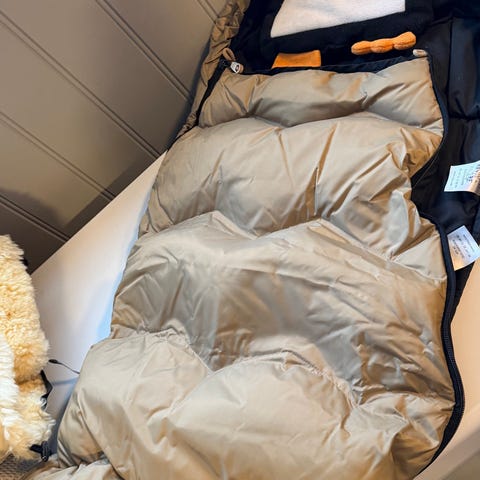 Veldig varm og god sovepose i dun og fjær, med forlengerdel.