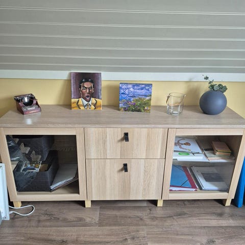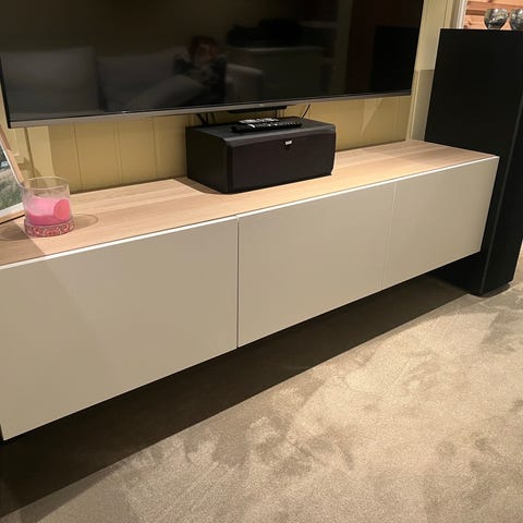 Bestå innredning med skuffer og hyller med høyglansete hvite dører.