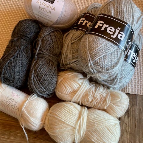 2 hele nøster med grå, 2 hele nøster med hvit + 2 åpne.