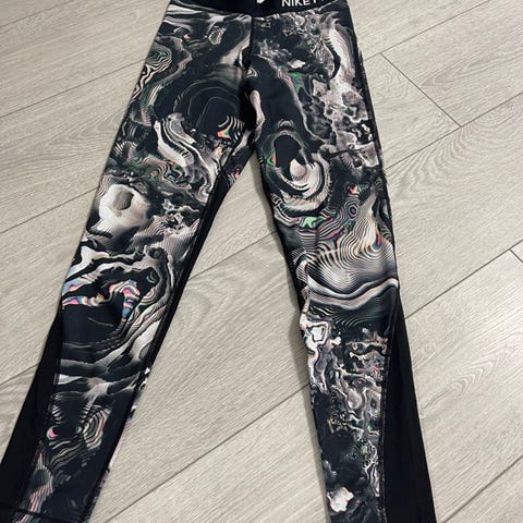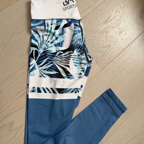 BARA Sportswear treningstights for dame i størrelse M. Tightsen har høyt, hvitt liv og flerfarget mønster med blomster- og dyreprint i mørke og lyse toner. Materialet består av en elastisk blanding med polyester og elastan som egner seg til trening og fitnessaktiviteter. Passer til bruk på treningssenter, hjemmetrening eller annen fysisk aktivitet der det er behov for bevegelige og tettsittende treningsklær. Lite brukt