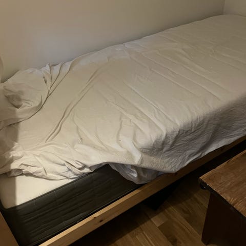 IKEA seng med madrass i treverk. Sengen har treramme og ribbebunn, og leveres med en madrass i standard enkeltsengstørrelse. Passer som enkeltseng på soverom, gjesterom eller hybel. Fargen på rammen er natur tre, mens madrassen har et lyst tekstiltrekk.