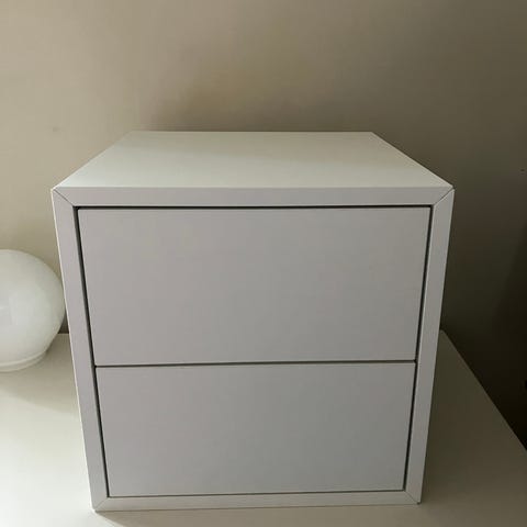 To IKEA skap/nattbord i hvit utførelse selges samlet. Skapene har en enkel, rektangulær form med slette fronter og hengslede dører. Hvert skap har én innvendig hylle som gir to oppbevaringsrom. Egnet som små oppbevaringsskap i stue, gang,m eller soverom.