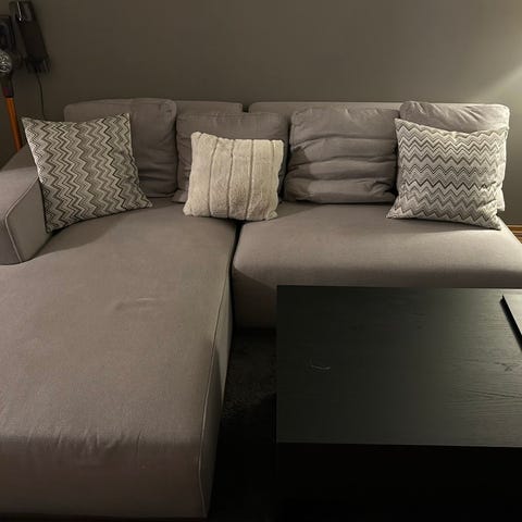 Beige soffa 245cm bred. Det er bruksmerker/ opprevede tråder etter en katt eller grei
