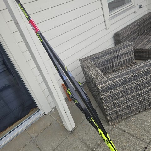Skiene er konstruert for skøyting og har lett racingsåle. Bindingene er montert på platen og er justerbare. Størrelse er 165 cm. Kr. 700, pent brukt og er vokset med Swix CH7.